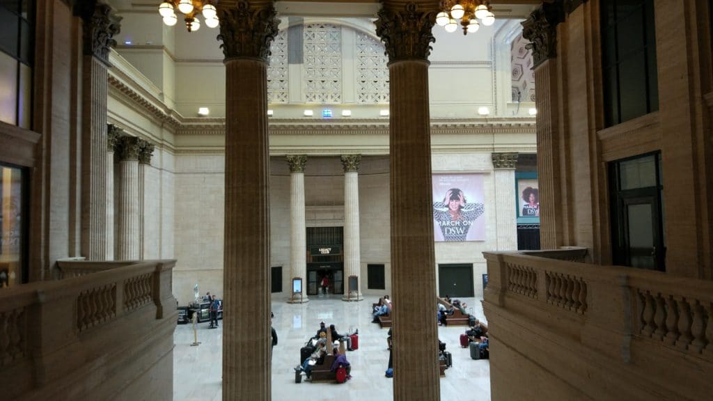 Me encontraba volviendo de una entrevista de trabajo y tocaba coger el tren en la estación central de Chicago, más conocida como Union Station. Entré por las puertas, levanté la vista hacia esa nave central de techos altísimos y columnas colosales, y algo en mi cerebro hizo click. Esto me suena. Esto lo he visto antes.