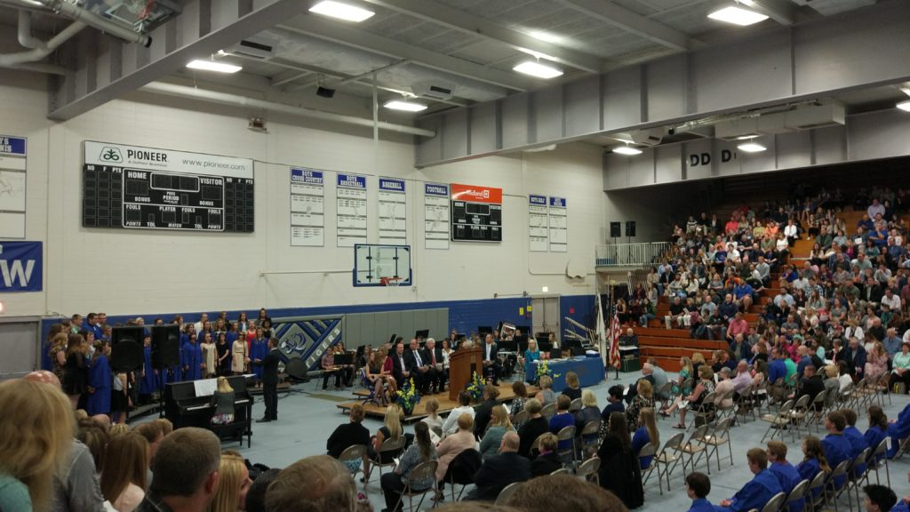 El maestro de ceremonias, que suele ser el director o directora del centro, dedica unas palabras a los estudiantes y repasa los acontecimientos vividos ese año. Al terminar, el coro entona el himno nacional de los EE.UU. haciendo que todos los asistentes se pongan en pié y la mayoría repita el himno con la mano en el pecho.