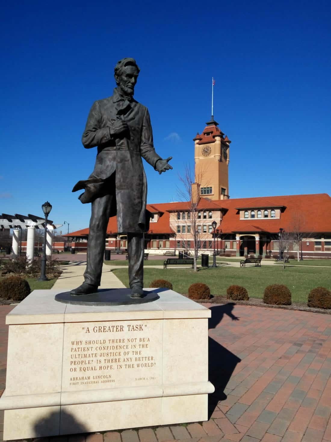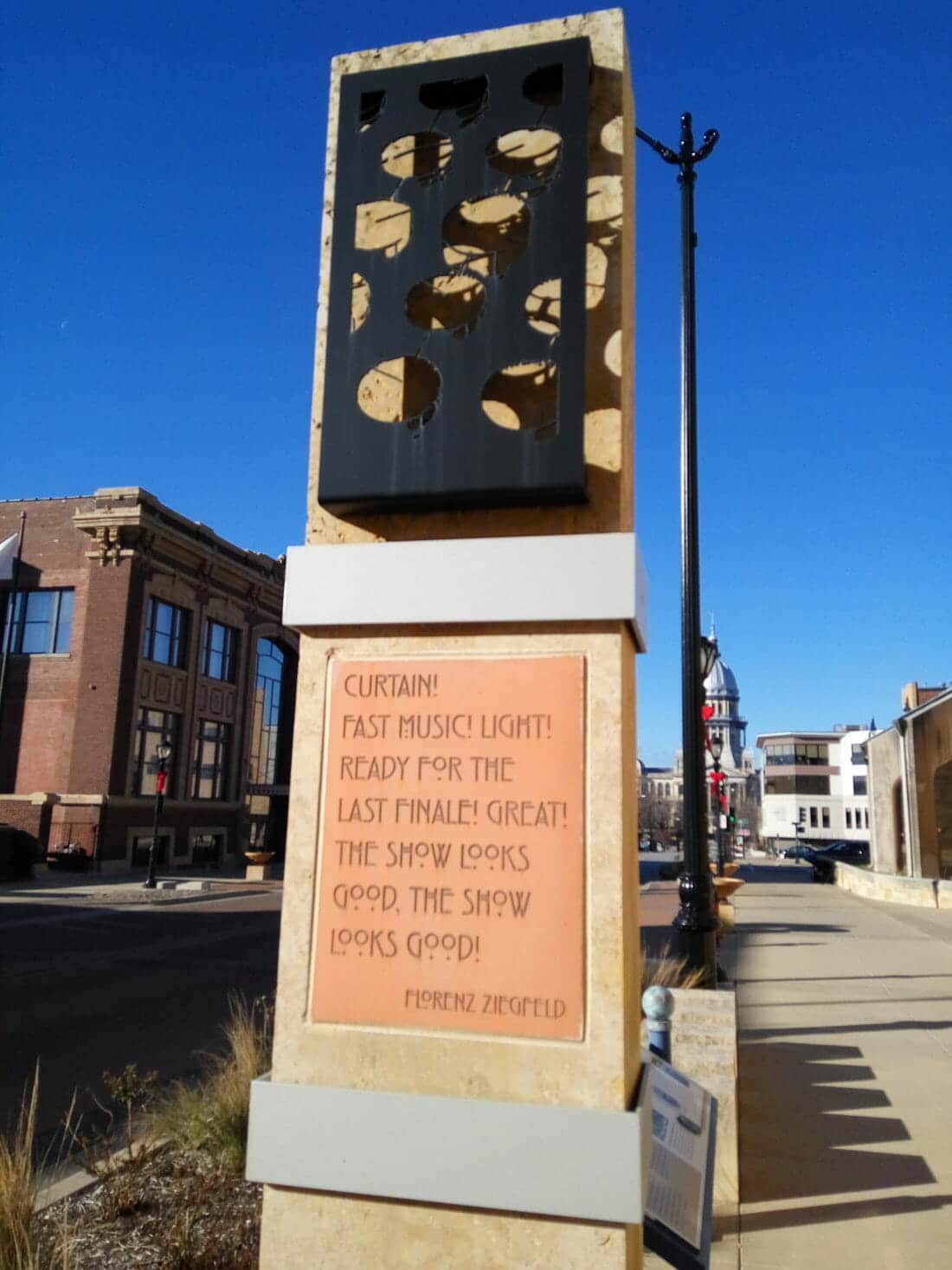 Paseando por las calles del centro de la ciudad, me topé con la Avenida del Capitolio (Capitol Ave.), una interesante avenida de adoquines con anchas aceras por donde pasear. Cada ciertos metros puedes descubrir pequeñas esculturas o pilares conmemorativos con algunas obras de arte y citas célebres de ilustres personajes de Illinois.